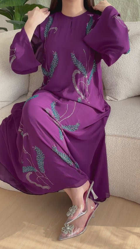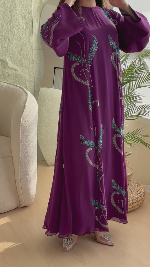 نوع القماش شيفون، فيها خرز شك يدوي مع فصوص مثبته بالحرارة. من الجهتين