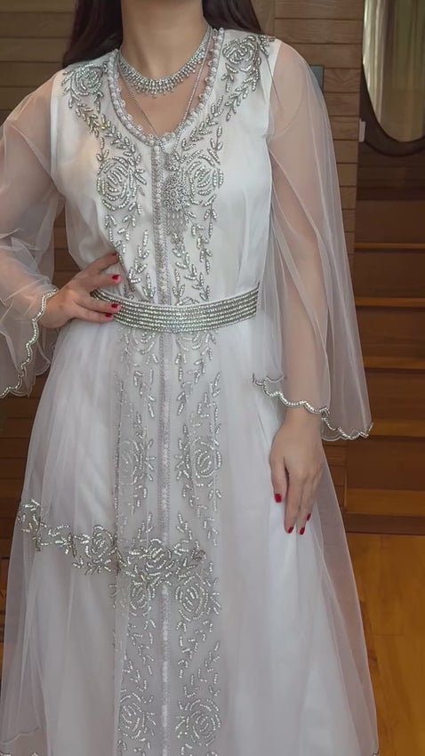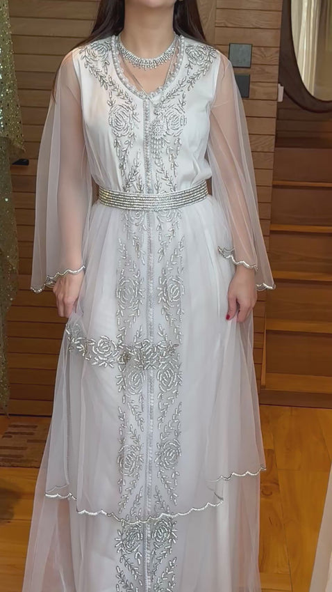 فستان يفيض إشراقًا، بتطريز دقيق يلمع بهدوء وقَصّة انسيابية تلامس الرقي.